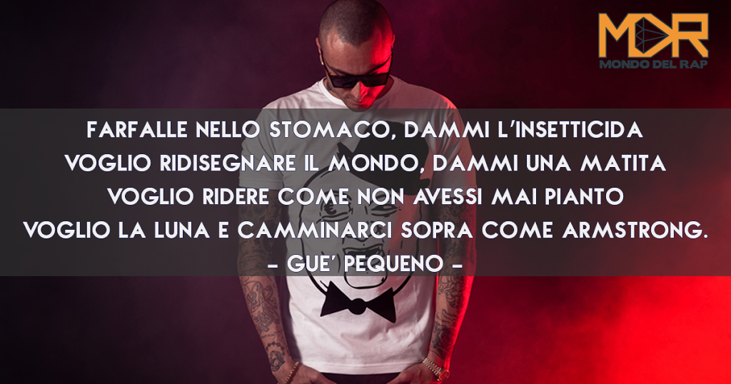 “Farfalle nello stomaco, dammi l’insetticida, voglio ridisegnare il mondo, dammi una matita, voglio ridere come non avessi mai pianto, voglio la luna e camminarci sopra come Armstrong.” Gué Pequeno.